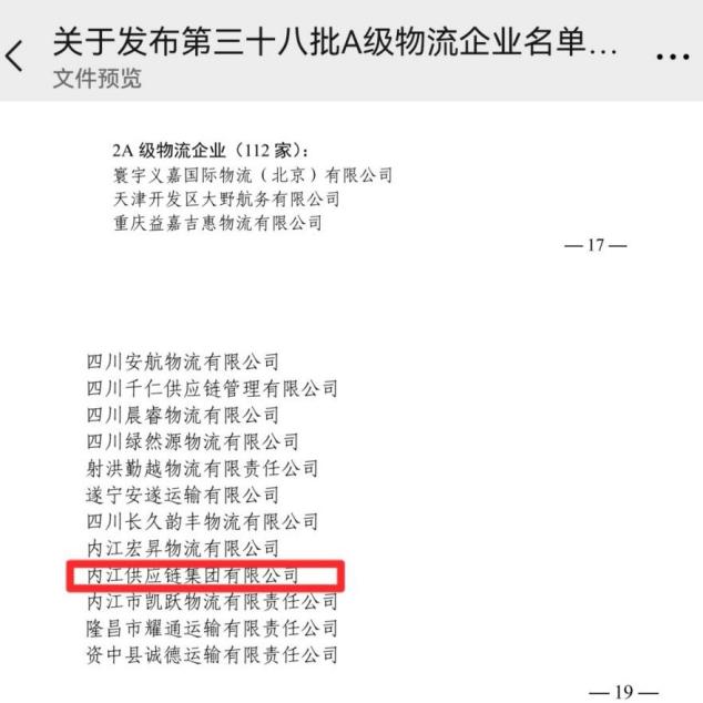 全國A級物流企業(yè)是我國物流領(lǐng)域最具權(quán)威的資質(zhì)認(rèn)定,近日,全國第三十八批次A級物流企業(yè)結(jié)果名單揭曉,內(nèi)江路橋集團(tuán)下屬企業(yè)內(nèi)江供應(yīng)鏈集團(tuán)有限公司進(jìn)入榜單之列,被中國物流與采購聯(lián)合會授予“國家2A級物流企業(yè)”稱號。